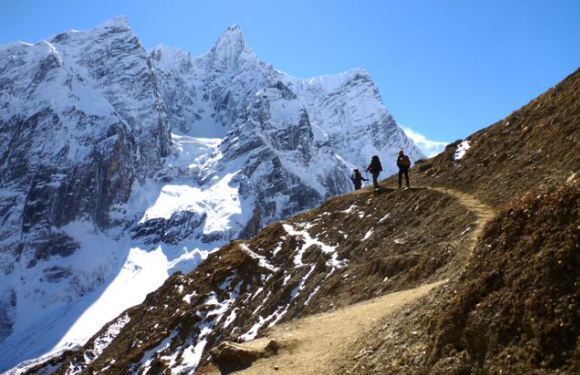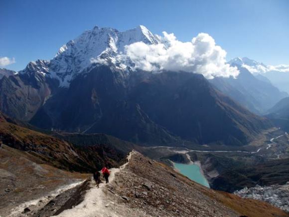 The ascent of Larkya La (16,752 ft) is a gradual winding climb, until we reach the northern face of the Larkya Glacier. From the top the views of Cho Danda and Larkya Peak are incredible. A long descend to the valley trail we pass the village of Tambuche, and finally arrive Bim Thang.